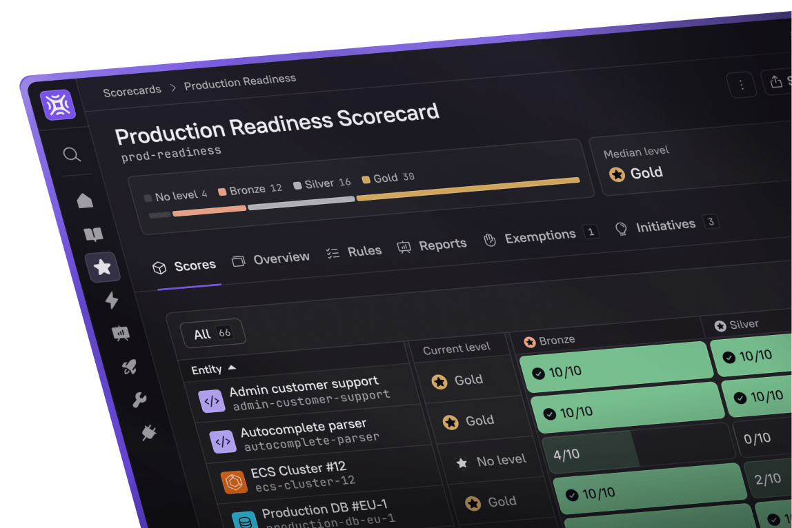 Every service is continuously scored against your standards, gaps are surfaced automatically, and teams fix issues before they become incidents.